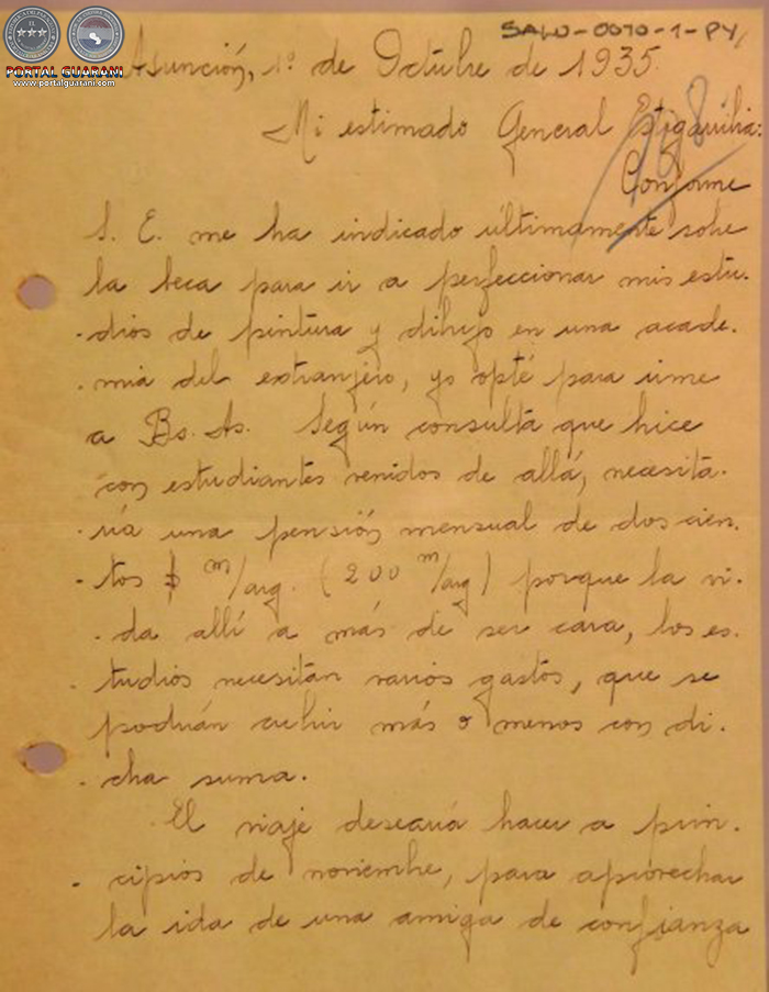 Cuando encontró la posibilidad de postularse, en la posguerra del Chaco, aprovechó el contacto social y le escribió al general Estigarribia para pedirle la asignación para estudiar pintura en Buenos Aires, en la Escuela de Bellas Artes de la Cárcova, una famosa academia en versión más bohemia y austera. En su carta le solicitó los 200 pesos de pensión. Logró la beca tres años después y fue a estudiar a la capital argentina cuando ya tenía más de 30 años.