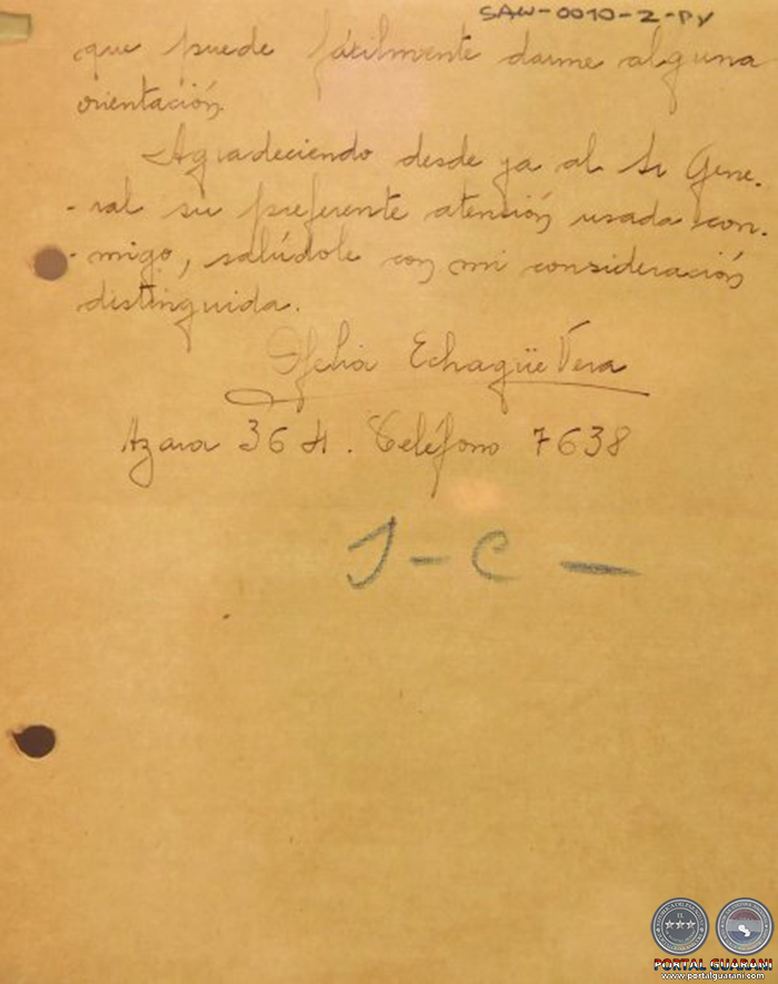 La carta de Ofelia Echagüe Vera al General Estigarribia, fechada el 1 de octubre de 1935. Colección Vera-Scuderi