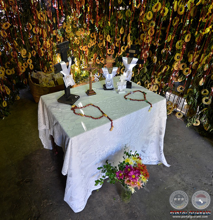 Pero la cuestión se complejiza (se enriquece más) cuando consideramos la cita que hace esta intervención. Como ya fuera señalado, la misma toma como punto de partida los adornos de las cruces funerarias empleadas principalmente durante el ritual del kurusu jegua, pero también durante otras celebraciones. El 3 de mayo, Día de la Cruz (Kurusu Ára), en muchas comunidades rurales y, aun, en ciertos barrios de Asunción, se celebra el Kurusu jegua, “el adorno de la cruz”. Este ritual consiste en un montaje de frondas espesas, recargadas de chipas y rosarios de maní (montaje llamado a veces Kurusu pesebre), cuyo interior se halla consagrado a cobijar las cruces de los parientes fallecidos. Retiradas del cementerio para la ocasión, guarnecidas con estolas de lienzo y encaje llamadas kurusu paño, las cruces son dispuestas en una mesa cubierta con mantel de encaje, flores, y candelas. Ante este altar se concentran el vecindario y el público en general, agasajados con chipa y cocido; así como los parientes y allegados a quienes se ofrece el karu guasu, siempre en homenaje a la memoria de los fallecidos y la invocación de sus resguardos.