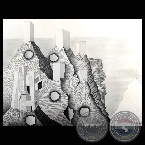 Así en los diseños de Gustavo Rodríguez J. La interpretación del elemento básico orgánico de la tierra, es elaborado por medio de un diseño extremadamente objetivo y minucioso, altamente sintético, que hace del motivo elegido un pretexto para mostrarnos de manera prolija la riqueza de aspectos que se puede obtener, mediante una visión artística, del objeto tratado. Sus “montañas” se van ordenando paulatinamente hasta que surge, irresistible, su contraste más definido, la materia organizada y estructurada por el hombre en esquemas anti-naturales, rígidos y exactos, como una simbiosis entre lo natural y lo metafísico. Las texturas variadas y fantasiosas se cristalizan en las grandes formaciones geológicas piramidales de estructuras cristalinas, como en una síntesis entre lo que era y lo que es el devenir de nuestro destino terrenal. El tratamiento técnico de los diseños es siempre de muy buen nivel plástico.
