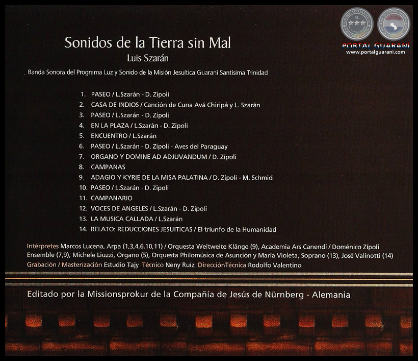 Intérpretes: MARCOS LUCENA, Arpa (1, 3, 4, 6, 10, 11) / Orquesta Welweite Klange (9), Academia Ars Canendi / DOMÉNICO ZIPOLI Ensemble (7, 9), MICHELE LIUZZI, Organo (5), Orquesta Philomúsica de Asunción y María Violeta, Soprano (13), José Valinotti (14)