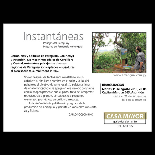 Instantáneas denomina Fernando Amengual a esta exposición de pinturas en Casa Mayor. Desarrolladas en los últimos diez años, estas obras se prefiguran como largos ejercicios de reflexión sobre el género del paisaje, en los que cabe no sólo el espacio sino el tiempo, pues han sido realizadas en locaciones y en tiempos reales, en la naturaleza y en la ciudad.