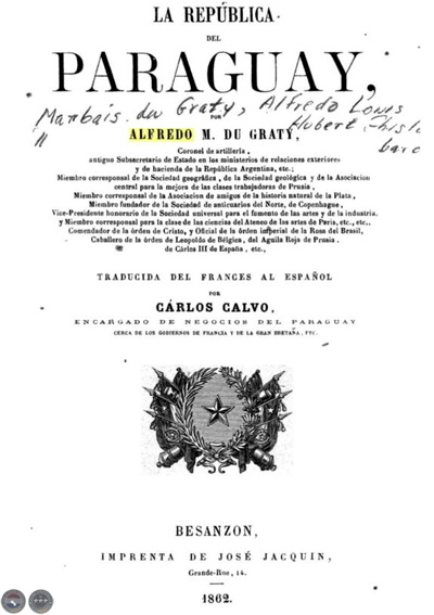 Inversamente, la Historia de la República del Paraguay de Alfred Marbais du Graty publicada en Bruselas en 1862 por encargo de Carlos Antonio López, sirvió- de entre otros fines- para difundir en textos e imágenes un país hasta entonces escasa (o míticamente) conocido debido al aislamiento impuesto por el doctor Francia.