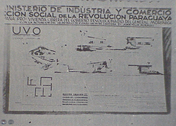 [217] Homero Duarte: “En el ’46, el Ministerio de Industria y Comercio llamo a concurso para un grupo de viviendas económicas, (a ser) ubicadas en un terreno ideal de 50 has, cuya ubicación podían elegir los concursantes. Nosotros (Natalio Barreiro, González Almeida y HD) elegimos un terreno real que se encontraba enfrente de lo que hoy es el Hospital Neuropsiquiátrico, sobre la avenida Venezuela. Se concibió un tipo de Vivienda a ser construida con bloques de hormigón y techo de fibrocemento, en dos tipos: unifamiliar (aislada) y pareada. Eran viviendas destinadas a obreros y artesanos, gente que tenia que trabajar en sus casas. Tuvimos el primer premio, pero nunca se construyó, era mas bien propaganda”.