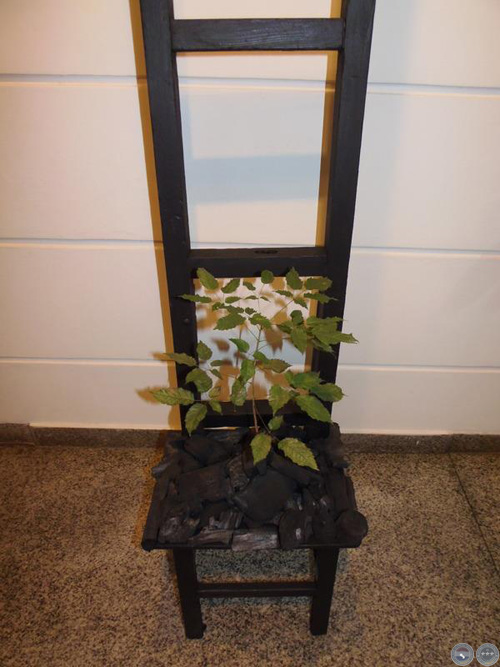 "FABULACIONES SOBRE EL FIN" Instalación. Silla, carbón, planta.Detalle.
