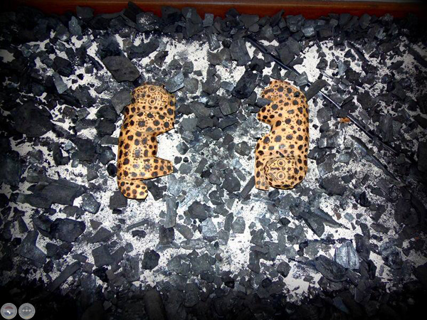 " ARA VAI". Instalación. Cenizas, carbón, yaguaretes tallado indigena.