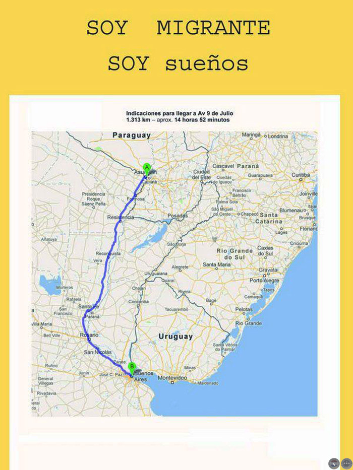 Así es como es la migración, como la sangre y el semen de las regiones, porque antes que países son regiones. Sin límites claros, zonas nebulosas, sinuosas, esquivando y sometiéndose a la modelización de los estados. Y sin embargo, la forma de América es la forma del tránsito, de las personas que viven y viajan con dolor, con pena, con conciencia y sin conciencia del tránsito, con búsqueda de futuro, y con futuros/pasados, con actualizaciones superfluas llenas de presentes, la migración es correr o caminar, o ir en colectivo, en bicicleta. La migración es hacer el amor con el tiempo y engañarlo, es el espacio, es respirar el cambio e impacientarse sobre la tierra.