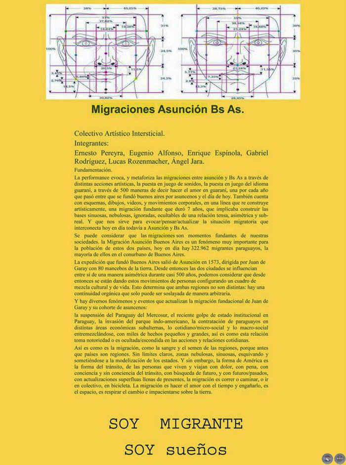 La performance evoca, y metaforiza las migraciones entre asunción y Bs As a través de distintas acciones artísticas, la puesta en juego de sonidos, la puesta en juego del idioma guaraní, a través de 500 maneras de decir hacer el amor en guaraní, una por cada año que pasó entre que se fundó buenos aires por asuncenos y el día de hoy. También cuenta con esquemas, dibujos, videos, y movimientos corporales, en una línea que re construye artísticamente, una migración fundante que duró 7 años, que implicaba construir las bases sinuosas, nebulosas, ignoradas, ocultables de una relación tensa, asimétrica y sub-real. Y que nos sirve para evocar/pensar/actualizar la situación migratoria que interconecta hoy en día todavía a Asunción y Bs As.