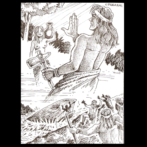 Cuando vio que "Yryapuára", cargando a su amada, corría hacia la selva, "Tapa" dijo a sus compañeros: