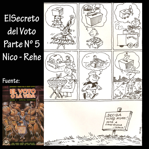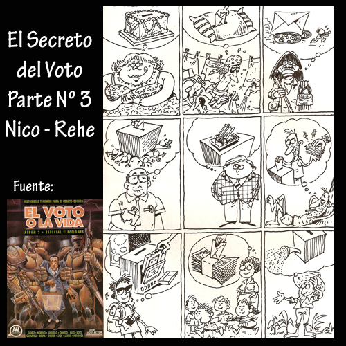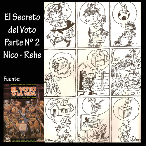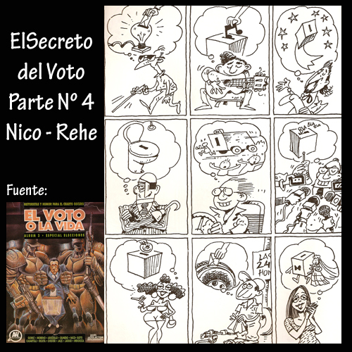 Los historietistas, por su parte, también presentan su visión de las elecciones, cada uno de ellos con su peculiar estilo y forma de pensar. Jaeggi, Argüello, Olmedo, Moreno y Goiriz expresan en sus obras una carga de violencia, crueldad y humor negro que nos insinúa un futuro no muy atractivo. Este álbum ha conseguido reunir a todos ellos, humoristas, guionistas e historietistas, para tomar un tema candente, las elecciones, como pretexto para reflejar las costumbres, los pensamientos, las opiniones, las emociones y las expectativas de nuestro pueblo y sus dirigentes.