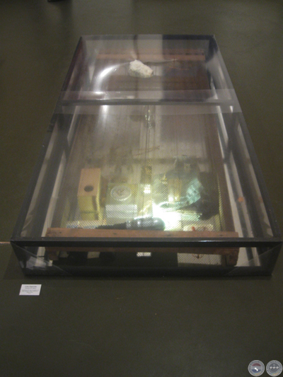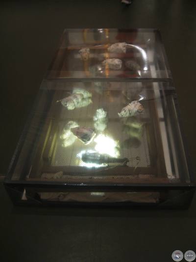 dos cajas de madera con tapas plásticas, camas, elásticos y objetos varios, 2012.