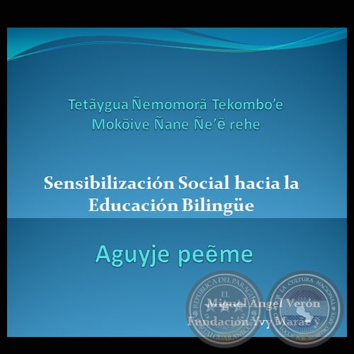 - Ñamombarete joaju Estado ha tetãyguakuéra ndive. Ko ñomongeta jajapovañaína ningo heñói jajokupyty rupi Estado ha tetãyguakuéra aty omba’apóva guarani ñe’ẽ ñemyasãime; ko joaju tekotevẽ ñamombareteve ha ñahendu avei umi ñe’ẽ poruharakuérape, ha ani ñande opavave rérape jajapopase opa mba’e. Ko’áĝa oĩhína heñói haĝuáicha Ñanduti Guarani Ñemombareterã-Ñanduti Social por la lengua guaraní, oĩmbatahápe aty ha tapicha omyakỹva kamisa lómo guarani rehe.