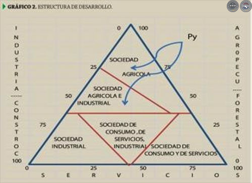 El triángulo del desarrollo. El triángulo de desarrollo demuestra la posición actual de Paraguay en una estructura evolutiva. Nuestro posicionamiento es la de la fuerte base aun del sector agropecuario–forestal con una incipiente industrialización. Aquí las Cooperativas juegan a su vez una importante función hacia el avance de la transformación de la materia prima en productos con mayor transformación y valor agregado (Gráfico 2).
