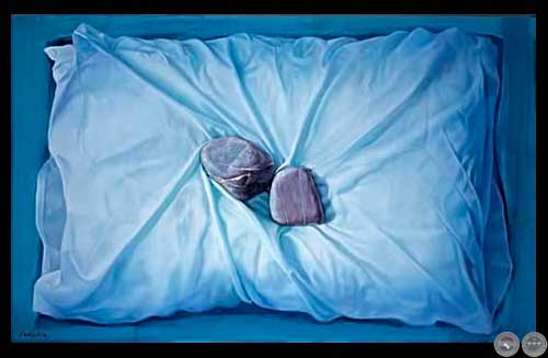 En sus obras más recientes Fracchia sigue el principio denotativo de menos es más. A través de la nitidez con la que pinta sus cuerpos y de la fidelidad de sus superficies despierta en el observador a una serie de connotaciones complejas. Tal es el caso de pinturas como CIELO VERDADERO (2004) y FALSO cielo (2004). La almohada deviene en cielo símbolo de las religiones masculinas, o se convierte en un terreno de donde emergen plantas, que aluden a la dupla simbólica tierra-mujer. Este sencillo recurso de trastocar la morfología verosímil de un objeto tan simbólico como la almohada y la piedra potencia la descripción de naturaleza al convertirla en el cuadro en una suerte de milagro que recuerda las transubstaciones (del agua en vino, de la piedra en pan), y nos provee de un simbolismo acorde a nuestro contexto actual, con lo cual logra que la mirada contemplativa de la pintura se vuelva una especulación activa sobre lo onírico y la fantástico. A fin de cuentas la pintura de Fracchia se conecta con la tradición y el presente al convertirse en un foro donde la sola presencia apunta a una escenificación de mitos y ritos en los que todos participamos. Nos permite darnos cuenta de que la realidad es en principio un proscenio donde todos actuamos las escenas de nuestra vida e historia, que al verlas en sus pinturas resultan tan familiares como enigmáticas.