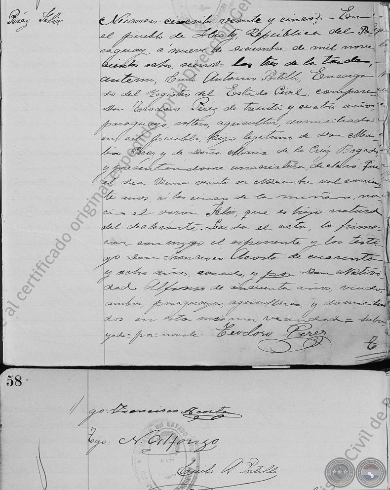 FÉLIX PÉREZ CARDOZO, nació en la localidad de Jhyaty, departamento de Guairá, el 2 de noviembre de 1908, localidad que hoy lleva su nombre, en homenaje a su genio de artista y su don de gente. Fueron sus padres TEODORO PÉREZ y CÁNDIDA ROSA CARDOZO. Cursó la escuela primaria en su ciudad natal y a temprana edad ya afloró en él su vocación de músico.