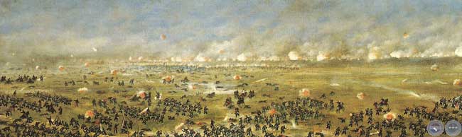 Llegó un momento en que la matanza se hizo general en toda la línea; mientras los artilleros lanzaban gritos de entusiasmo descargaban sus cañones, los disparos de fusilería se sucedían sincrónicamente con cortos intervalos. Una hilera cargaba y otra hacía fuego, los que no hacían fuego lanzaban bombas de mano.