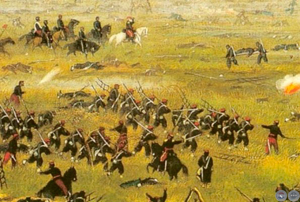Las cuatro columnas, ya indicadas en el orden de batalla, avanzaron sobre nuestras posiciones. Todas las columnas aliadas se pusieron en movimiento a la hora ya indicada, en perfecto orden, al son de clarines y al toque marcial. Pasado el tiempo de escurrimiento enemigo aparecieron los primeros batallones frente a la línea de defensa, con vistosos uniformes, alineados en rigurosa formación, marchando al son de música militar con sus banderas desplegadas.