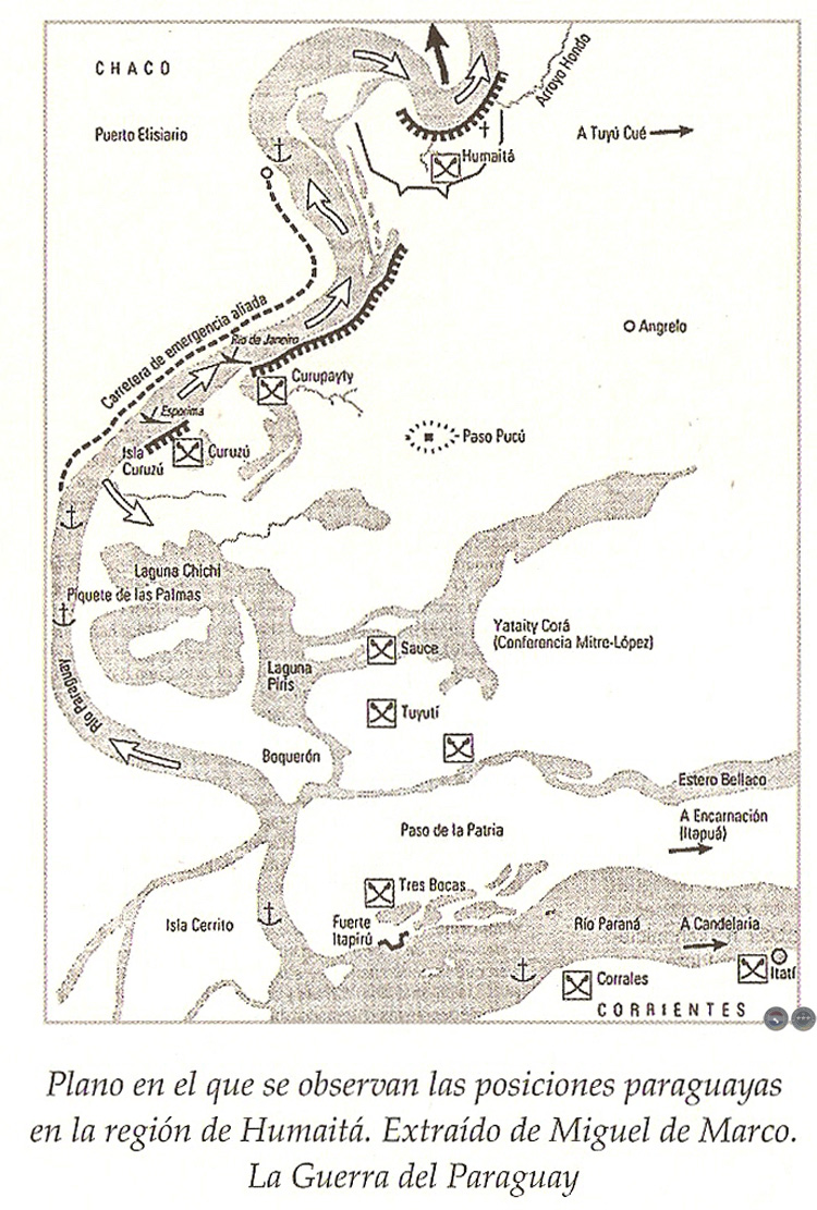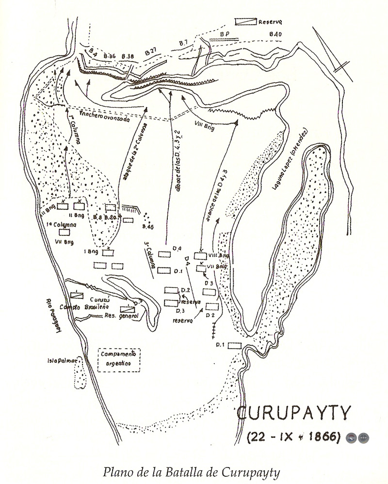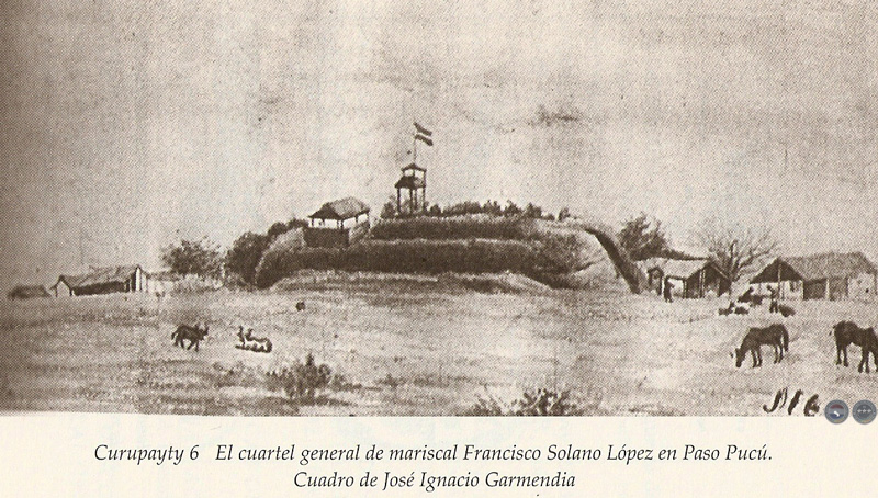 Señala el autor que entre Curuzú y Humaitá existía una batería que defendía el paso del río en un lugar denominado Curupayty, que tenía como guarnición una pieza de artillería de calibre 68, servida y custodiada por 50 hombres bajo el mando del alférez José Pantaleón Urdapilleta.