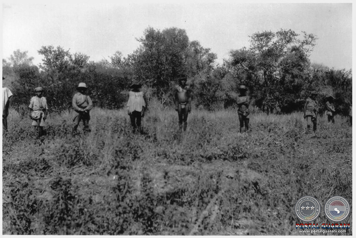 Guías Indígenas (probablemente tapiete) y militares bolivianos en el Chaco, c. 1932 (Fotografía: Ángel Ayorea).