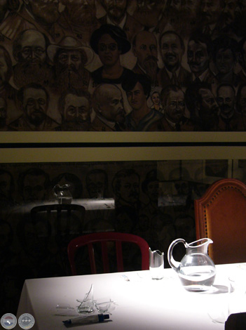 Mónica González instala una mesa en el centro de la sala cubierta de grandes óleos de modo que la misma ocupa un espacio mediador, un obstáculo o un señuelo para las miradas de los retratados y para la de los asistentes, una interferencia para la pulsión visual, de por sí interferida por intersecciones complicadas. Sobre la mesa, un mantel blanco y ocho vasos quebrados, dispuesto cada cual ante una silla. En el centro, como único punto lumínico una jarra de vidrio cargada hasta la mitad de agua. Al lado de cada vaso roto, un pomo de pegamento para restaurar cristales. Como en la obra anterior, las todas las sillas son diferentes entre sí.