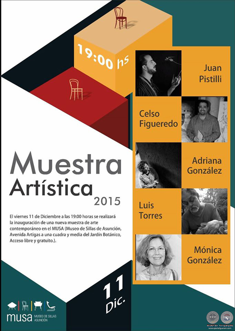 El viernes 11 de diciembre a las 19:00 horas se realizará la inauguración de la Muestra Artística 2015 en el MUSA (Museo de Sillas de Asunción, Avenida Artigas a una cuadra y media del Jardín Botánico). Con la misma, el MUSA cierra su ciclo anual de actividades y celebra, a su manera, las fiestas de fin de año. Los artistas que expondrán sus obras son: