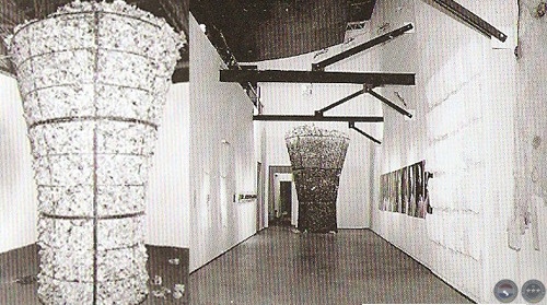 Es en este contexto que debe ser inscripta la obra que presenta ahora la artista. Consiste ella en un cesto descomunal construido con varillas metálicas, a modo de las papeleras de oficina. El recipiente se halla repleto de hojas de periódico arrugadas; residuos de una información que ha perdido la vigencia. O que nunca la tuvo: formalmente, las publicaciones se encuentran deformadas, estrujadas, en gran medida por la instrumentalidad del mercado. Alisado por los imperativos de la publicidad y la noticia rápida y fácilmente consumible, el lenguaje pierde espesor y densidad, rugosidad: pierde los pliegues que precisa la diferencia para manifestarse en su opacidad y sus espesores.