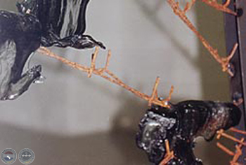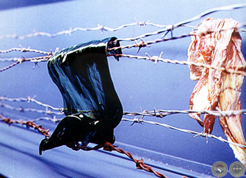 Vidrio termomodelado, alambre de púa, plancha de acero, cecinas.
