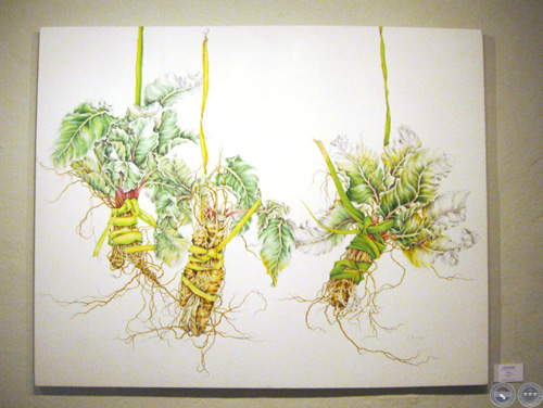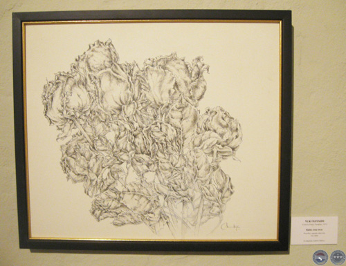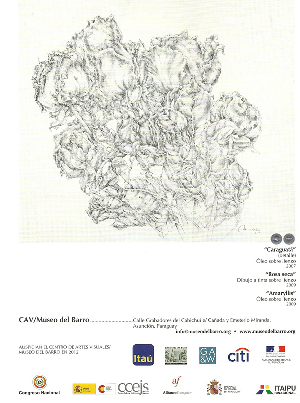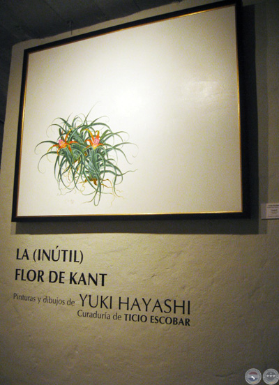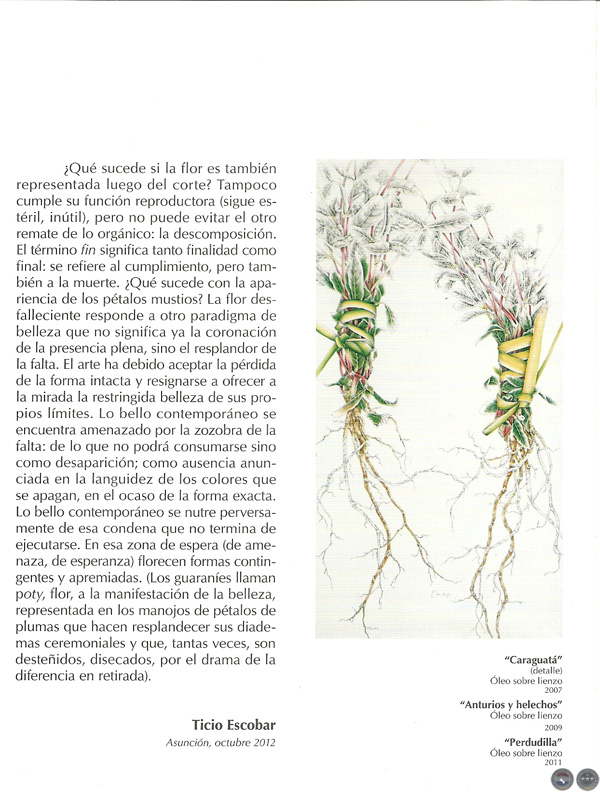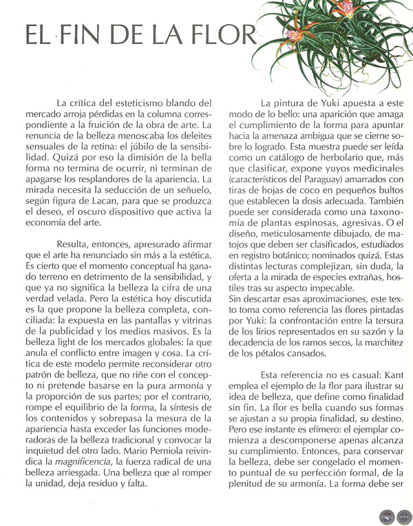 (…) La pintura de Yuki apuesta a este modo de lo bello: una aparición que amaga el cumplimiento de la forma para apuntar hacia la amenaza ambigua que se cierne sobre lo logrado. Esta muestra puede ser leída como un catálogo de herbolario que, más que clasificar, expone yuyos medicinales (característicos del Paraguay) amarrados con tiras de hojas de coco en pequeños bultos que establecen la dosis adecuada. También puede ser considerada como una taxonomía de plantas espinosas, agresivas. O el diseño, meticulosamente dibujado, de matojos que deben ser clasificados, estudiados en registro botánico; nominados quizá. Estas distintas lecturas complejizan, sin duda, la oferta a la mirada de especies extrañas, hostiles tras su aspecto impecable. Sin descartar esas aproximaciones, este texto toma como referencia las flores pintadas por Yuki: la confrontación entre la tersura de los lirios representados en su sazón y la decadencia de los ramos secos, la marchitez de los pétalos cansados.(…)