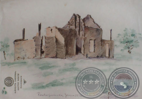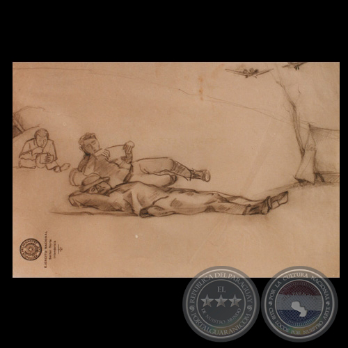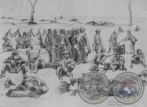... "Uno de los bocetos, pintado a lápiz, es el vivísimo retrato de mi inolvidable ordenanza y amigo, el Soldado Florentino Ocampo, que murió en Cañada El Carmen el 13 de julio de 1934: es de creer que la personalidad física de Florentino Ocampo, campesino paraguayo típico y como tal optimista, bullanguero y charlista incurable, quedada grabada en el subconsciente del artista, pues que en una pintura mural del Ministerio de Defensa Nacional, hecha por Holden Jara, uno de los ,soldados paraguayos del Chaco es precisamente Florentino Ocampo, en este caso de cuerpo entero... "