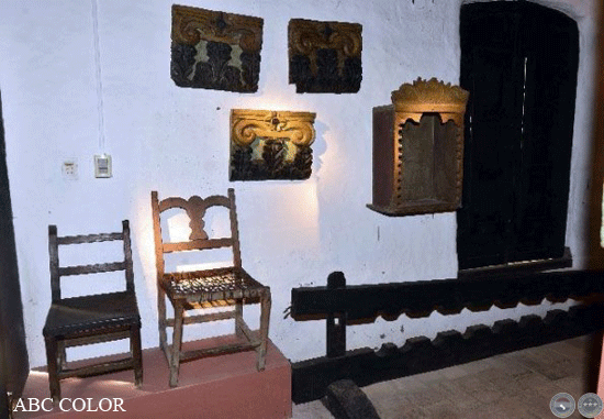 Maderas decoradas de la vieja iglesia de Pilar, sillas tramadas en cuero