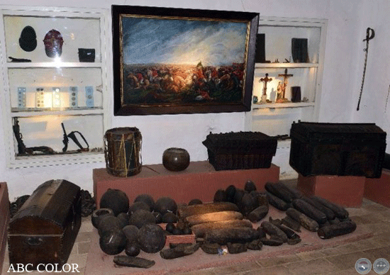 Varias piezas relacionadas a la Guerra de la Triple Alianza (1865-1870) enriquecen el montaje. Hay un tambor con pintura tricolor e inscripciones originales: “Viva la República del Paraguay”; ollas de hierro, mortero rústico, espadas, fusiles, un quepis de oficial y una silla con las iniciales FSL que se trajo de la casa de Juanita Pesoa, pareja sentimental de Francisco Solano López.