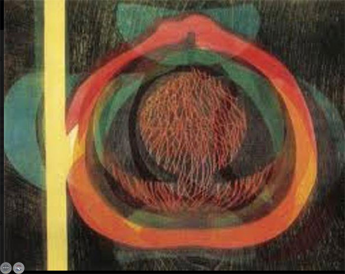 Comentario: “Color y grabado son tratados e integrados con vigoroso espíritu de síntesis y fuerza emotiva que se realizan -además de su valor intrínseco- de manera singularmente afín a la sensibilidad artística actual. Densa emotividad del color, forma grabarla libre y vigorosa expresividad y unidad estilística notablemente logradas son los rasgos sobresalientes de esta muestra”. LIVIO ABRAMO, 1993.