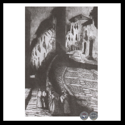 Un poco diferente sería el destino de otro artista paraguayo que, con poca diferencia de tiempo, también se dirige por cuenta propia a estudiar en Europa: ANDRÉS CAMPOS CERVERA (1888-1937). El artista recala primero en la Academia de San Fernando de Madrid, donde trabaja con maestros de la talla de Sorolla y otros, se dirige luego a Italia y por último se queda en París durante los años de la guerra del 14. En ese lapso, no sólo practica la pintura sino que también toma conocimiento del grabado en metal, técnica con la cual también realizaría trabajos de excelente calidad, entre los que debe mencionarse su pequeño aguafuerte -quizá heliograbado- "EL PORTALET, VILLAJOYOSA", de 1923.