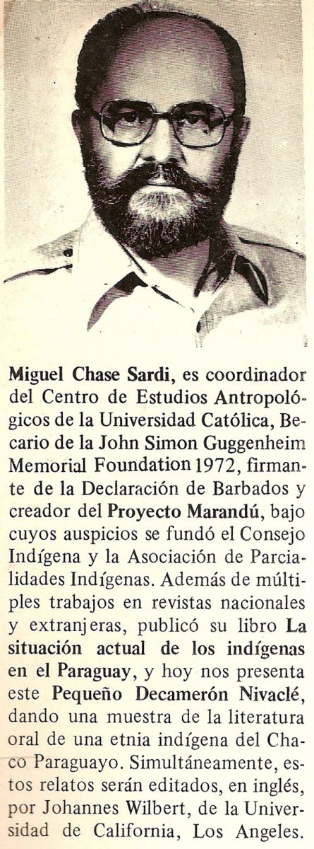 Aunque Natalicio González y Víctor Morínigo llamaran la atención en modo diverso tiempo hace, sobre fábulas o mitos guaraníes, nunca se les ocurrió -o no tuvieron la ocasión- de acercarse al indio para pedirle como hermano su oración a la vida. Fue quizá León Cadogan el primero. Luego se siguieron otros; pocos, siempre; que se aproximaron a la fogata del indio, para escucharle y hacerle hablar con su propia voz: Marcial Samaniego, Miguel Chase Sardi, uno de los más empecinados a esta tarea de salvamento de la cultura indígena.