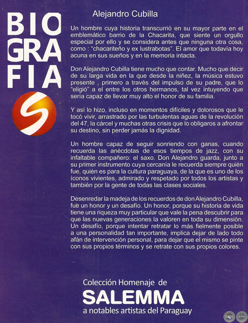 En esta entrega, rica en anécdotas y en vivencias populares, presentamos la biografía del maestro Alejandro Cubilla, como parte de esta orgullosa colección de libros sobre los grandes talentos del Paraguay.