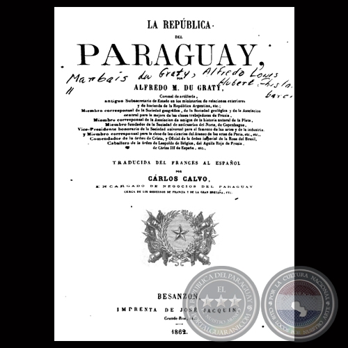 DU GRATY, ALFREDO : Investigador naturalista. El barón Du Graty nació en Bélgica, trasladándose en 1850 al Río de la Plata. Intervino en la Argentina en la lucha contra el Gral. Rosas. Se incorporó al ejército de Entre Ríos y en 1851 realizó la campaña contra el ejército sitiador de Montevideo. Intervino en el Pasaje del Paraná y participó de la Batalla de Caseros, donde fue ascendido a teniente coronel.