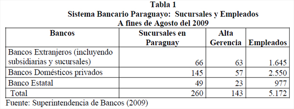 Los bancos extranjeros predominan en el mercado paraguayo (60% del total de activos bancarios); y posterior a la crisis bancaria, desde 1997 hasta el 2002, dos bancos grandes (CITIBANK y ABN-AMRO BANK) tenían una participación del mercado de más del 30%. Sin embargo, desde el 2006 los agentes han cambiado debido a que INTERBANCO y BBVA son