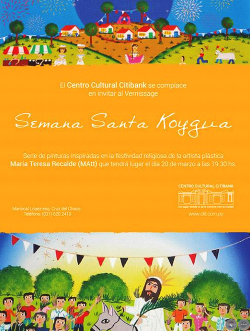 El miércoles 20 de marzo a las 19:30 hs. se habilitó la exposición de pinturas “Semana Santa Koygua” de María Teresa Recalde (Matt) en el Centro Cultural del Citibank (Mcal. López esq. Cruz del Chaco). Esta muestra permanecerá habilitada hasta el 5 de abril, pudiendo ser visitada de lunes a viernes de 8 a 18 hs.