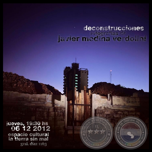 El artista y fotógrafo Javier Medina Verdolini presenta ahora, en el Espacio cultural “La tierra sin mal” (Gral. Díaz, 1163), la muestra titulada Deconstrucciones, una serie de fotografías urbanas recientes, de mediano formato. Esta exposición se inaugurará el jueves 6 de diciembre, a las 19:30 hs. La misma es el resultado de una mirada analítica sobre la arquitectura y la ciudad contemporáneas, centralizada, eventualmente, en el área metropolitana de la ciudad de Asunción. Representando unos desolados escenarios que tanto el núcleo histórico de la ciudad como su periferia vienen generando desde hace tiempo: estructuras derruidas, espacios vacíos o paisajes en proceso de transformación degradante.