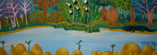 MEDINA, MARCELO : Maneja el color con insolencia y narra mundos insólitos (...), no vacila mucho en usar un repertorio fantástico y personal nutrido del cómic y el clip, el cuento infantil y el refinado mito indígena: la memoria antigua y el sueño más reciente.