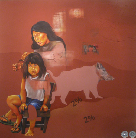 Buscando piojos de Carla Ascarza, mujer y niña ayoreos, técnica mixta, 150 x 150 cm.