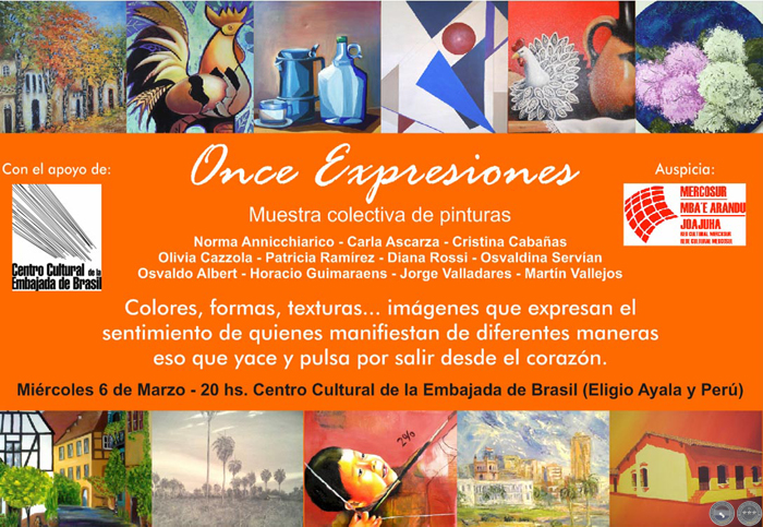 El miércoles 6 de marzo se inauguró la exposición colectiva “Once Expresiones” en la Embajada de Brasil (Eligio Ayala y Perú). La muestra reúne a once artistas de nuestro país, cada cual con su propio estilo y temática; algunos ya consagrados y con destacada trayectoria en el medio y otros emergentes pero todos con un valor artístico que se destaca.