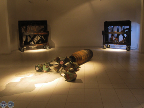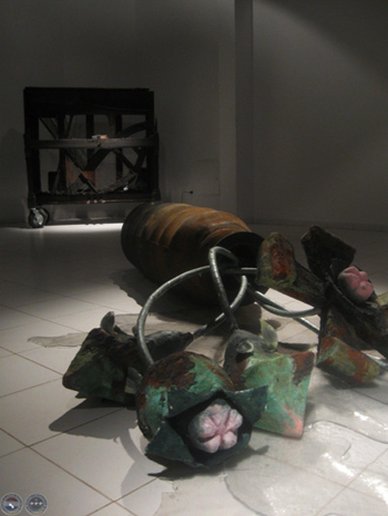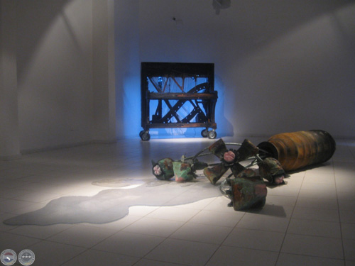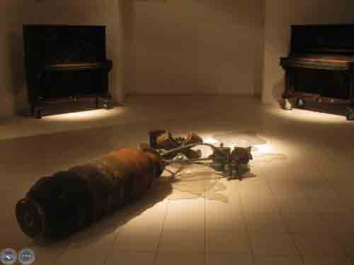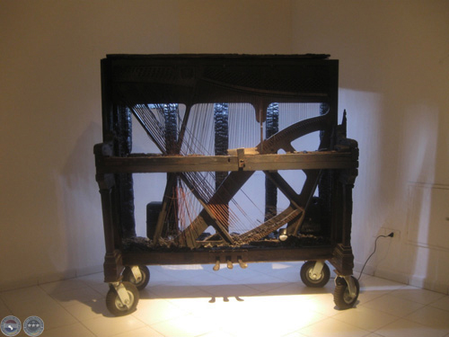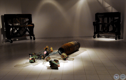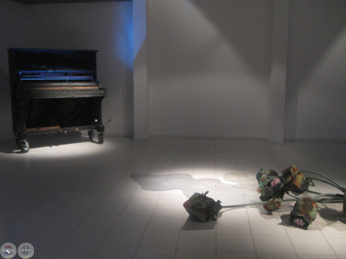 Cuatro pianos son presentados bajo una luz fría. En el medio de la sala, un florero tumbado esparce sus flores sobre un charco de agua. Pero, en rigor, los pianos no son pianos: son fantasmas, despojos o ruinas de pianos; instrumentos que fueron abatidos por el incendio que sufriera el edificio del Instituto Municipal de Arte (IMA) en abril de 2011. Las flores tampoco son flores; o al menos no son flores reales, naturales. Confeccionadas con tergopol, goma y cartón, forradas y pintadas con colores verde herrumbre, actúan su falsedad; se muestran toscas, demasiado grandes. Son flores extrañas que, por un instante, recuerdan las formas deliberadamente rígidas pintadas durante la primera modernidad paraguaya (por Olga Blinder y Edith Jiménez, básicamente). El charco también es ficticio: corresponde a un recurso representacional armado con resina transparente que simula un espejo de agua.