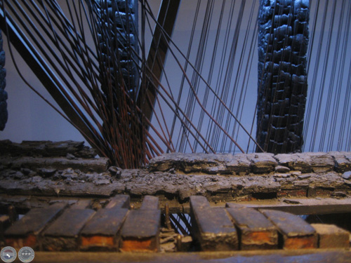 Pero este mundo de simulacro, utilería y desecho –de rústicos recursos especiales‒, como cualquier escena dispuesta, se enciende de pronto con la música. Al acercarse alguien a cada piano activa una secuencia sonora que hace revivir los instrumentos. Por un rato. A medias: la música patina de pronto; una inflexión sin causa trastoca la melodía, desfigura la armonía hasta el límite; desemboca en otro registro cicatrizado, a medias quemado. El triunfo de la estética: aun lesionado, el sonido –la percepción‒es capaz de conmover la escena yerta y de reflejarla, entera por un instante, en un espejo.