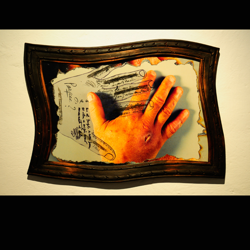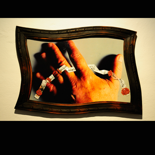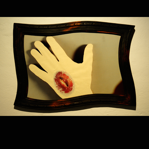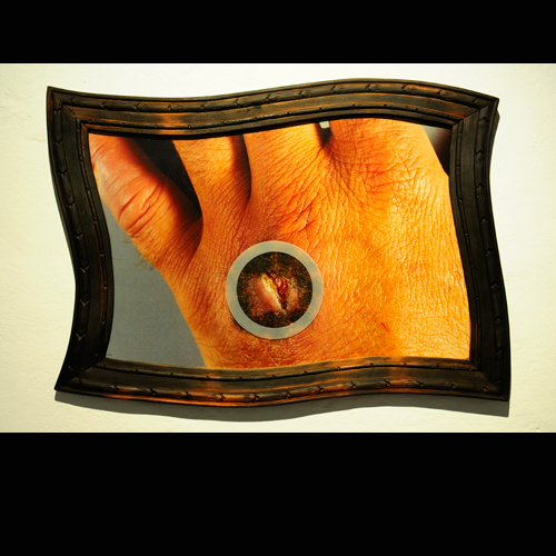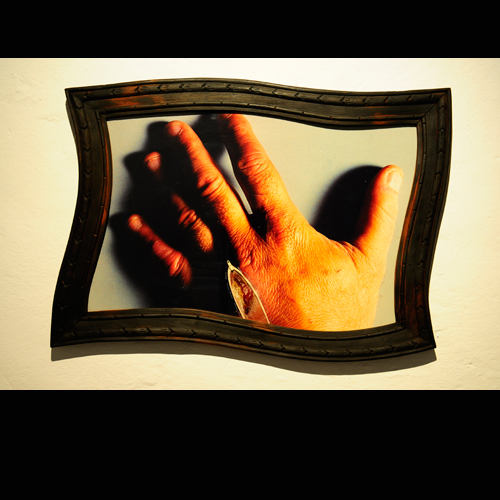 Lo importante ahora es la herida, la herida real que agrieta la mano; por eso una lupa aumenta sus bordes inflamados y el esmerilado del vidrio deja un claro sólo para mostrar el corte. Todo el resto es representación, montaje de escena, reflejos u opacidades: trampa del cristal que encubre, imagen devuelta por el espejo que cada cuadro levanta para tentar la mirada. Sólo la lesión es real: ante ella se cierran y entreabren los artificios del cuadro. Sólo la brecha que raja la piel abre un espacio en esa caja cerrada y lacrada. Sólo lo invisible (la sangre que aguarda, la carne violada, el mundo oscuro que enmascara la piel) puede rayar el límite y abrir una rendija, una herida, en la escena clausurada.