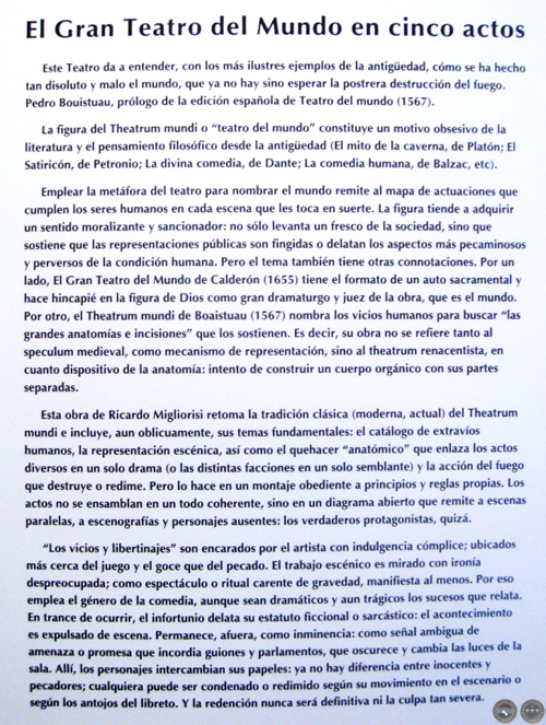“Los vicios y libertinajes” que denuncia el género Teatro del Mundo son encarados por el artista con indulgencia cómplice; ubicados más cerca del juego y el goce que del pecado. Según el texto de presentación, en el teatro migliorisiano, los personajes intercambian sus papeles: ya no hay diferencia entre inocentes y pecadores; cualquiera puede ser condenado o redimido según su movimiento en el escenario o según los antojos del libreto. Y la redención nunca será definitiva ni la culpa tan severa.