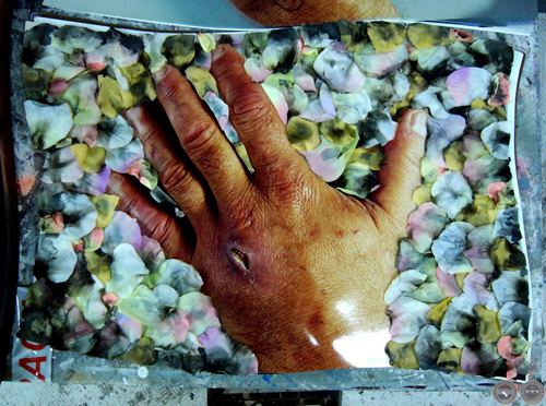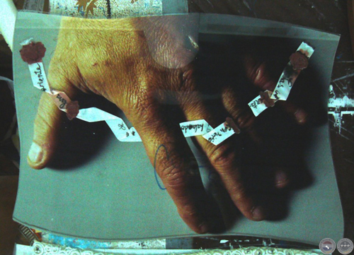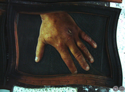 Las manos como herramienta del artista que mira el dorso entreabierto mientras cierra sus dedos entintados sobre el pincel, la gubia, el cuchillo o el lápiz. Con cada corte, trazo o pincelada, la herida late y su pulso imprime intensidades y pausas en el despliegue de la imagen.