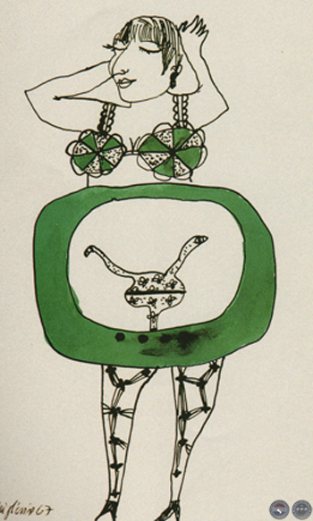 En los primeros dibujos presentados en la exposición de Tajy en 1966 ya está perfectamente definida esa figuración hibrida que mezcla hombres, objetos y animales y combina lo jocoso y lo dramático en un enredo promiscuo e inquietante: sus gallinas-vasijas, sus aves con zapatos y anteojos, ya anuncian ese revoltijo de órdenes y de reinos naturales que se traspasará a épocas históricas, geografías y diferentes niveles de realidad o de sueño.