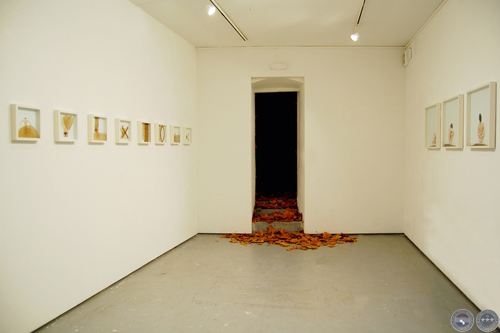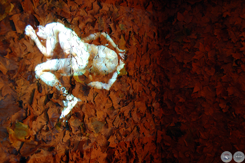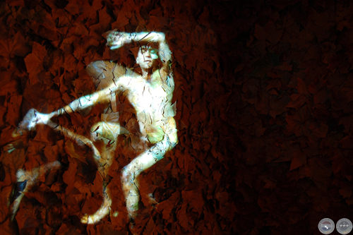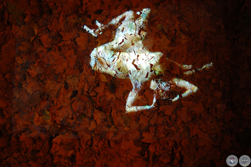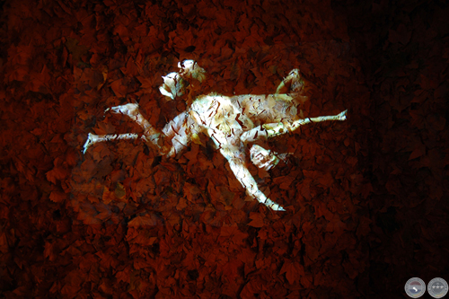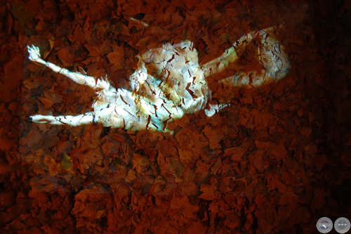 Exposición "CHANGEMENT DE PEAU" Vista de la video-instalación. Sala expositiva cubierta totalmente (techo, 4 paredes, piso) con hojas secas y video color proyectado sobre uno de los muros. Duración 3 minutos, loop, Audio stereo inviromment. Nantes-France. Diciembre 2007