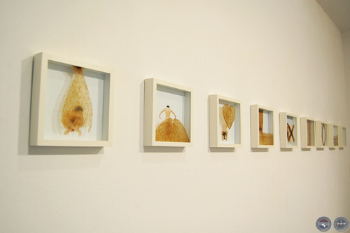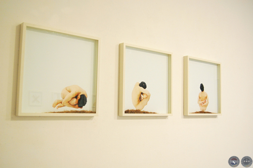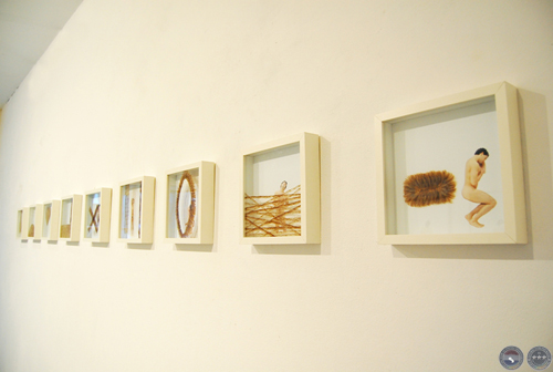 Exposición "CHANGEMENT DE PEAU". Galerie de L'ERBAN - École Regional de Beaux Arts Nantes, France 2007. Vista de la sala expositiva. Autoretratos intervenidos con alas de hormigas, fotografías color, 9 fotos de 25 x 25 cm c/u, y tríptico de 50 x 50 cm c/u.